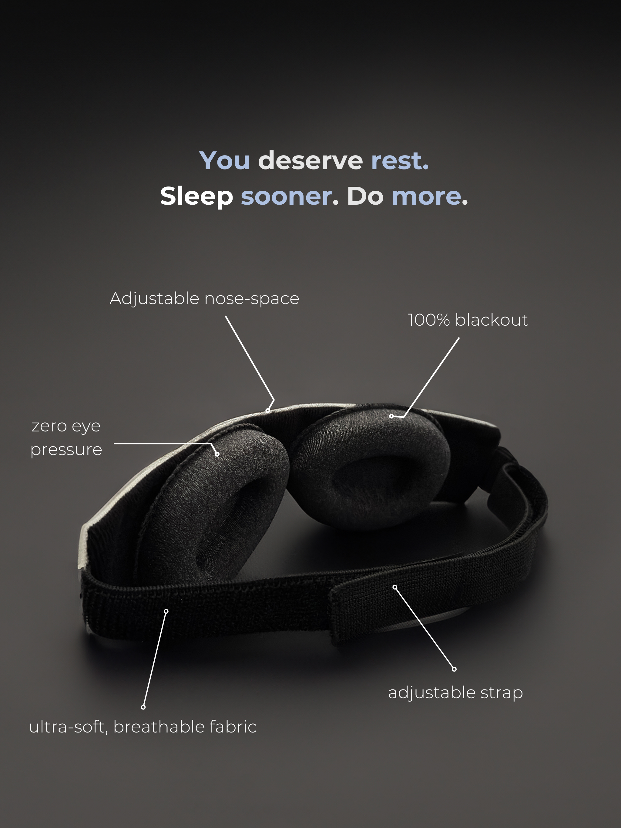 Enjoy uninterrupted, restorative sleep with absolute darkness—perfect for sensitive sleepers. Adjustable strap and removeable plush eye cups.